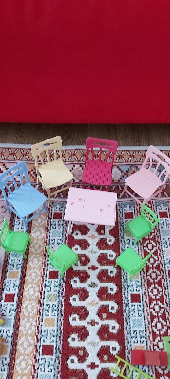 Pastel tonlarda çeşitli renklerde oyuncak mini sandalyeler ve küçük masa seti, hayal gücünü destekler.