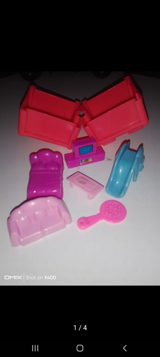 Renkli mini oyuncak seti; pembe yatak, kanepe, mavi kaydırak, küçük masa, bilgisayar ve pembe raketten oluşur.