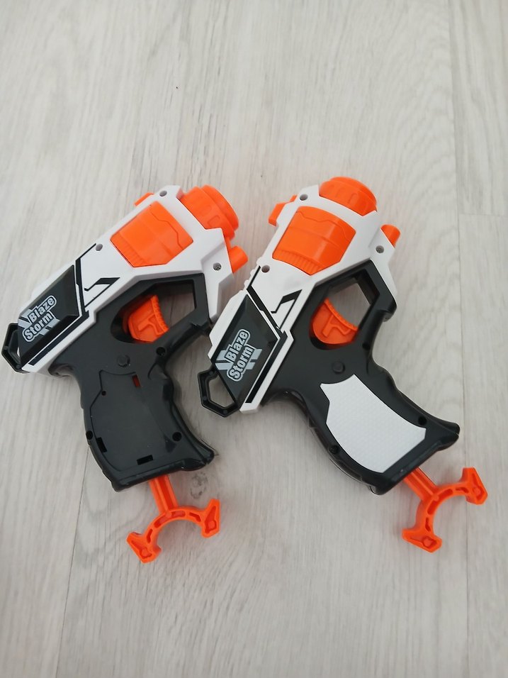 Beyaz, siyah ve turuncu detaylı, güvenli oyun için tasarlanmış iki renkli oyuncak tabanca seti.