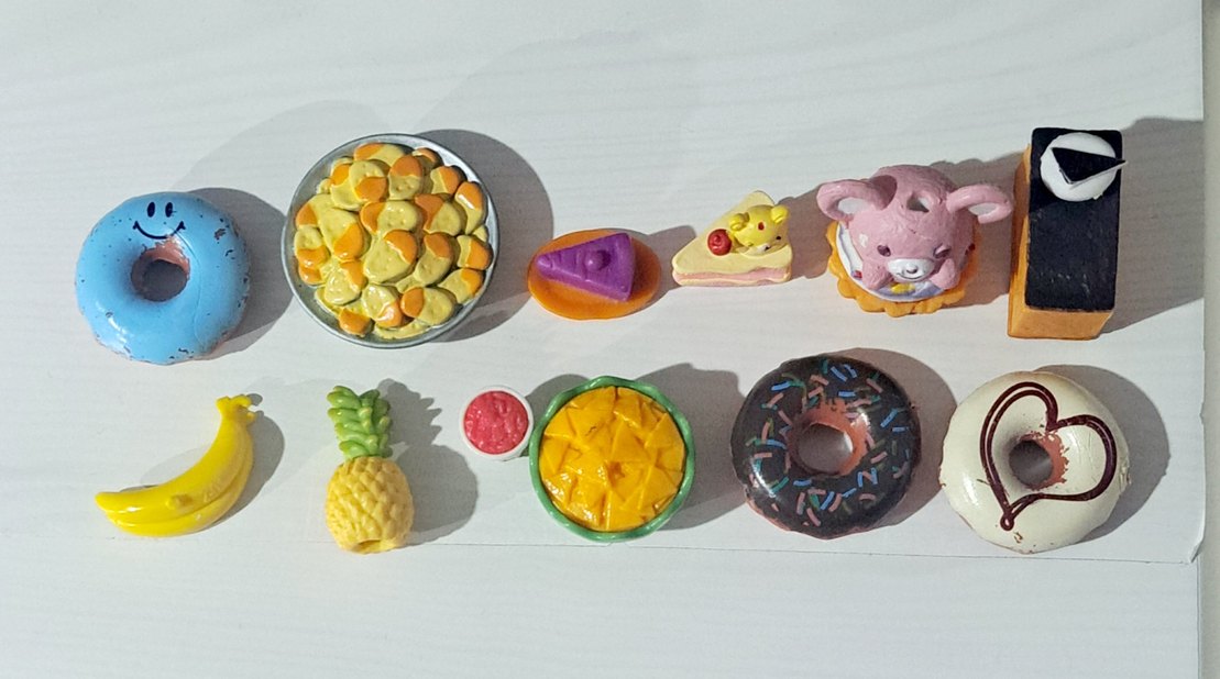 Ananas, donut, turta dilimleri ve diğer yiyeceklerin bulunduğu renkli mini oyuncak seti, hayal gücünü geliştirmek için uygundur. barbieler icin uygundur.