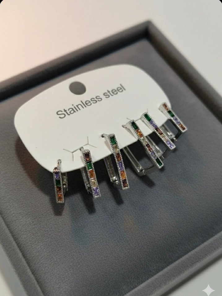 Paslanmaz çelikten üretilmiş, renkli payetli baskılı kısa uzunlukta minimalist ve çağdaş tarzda günlük kullanıma uygun küpeler. ✨