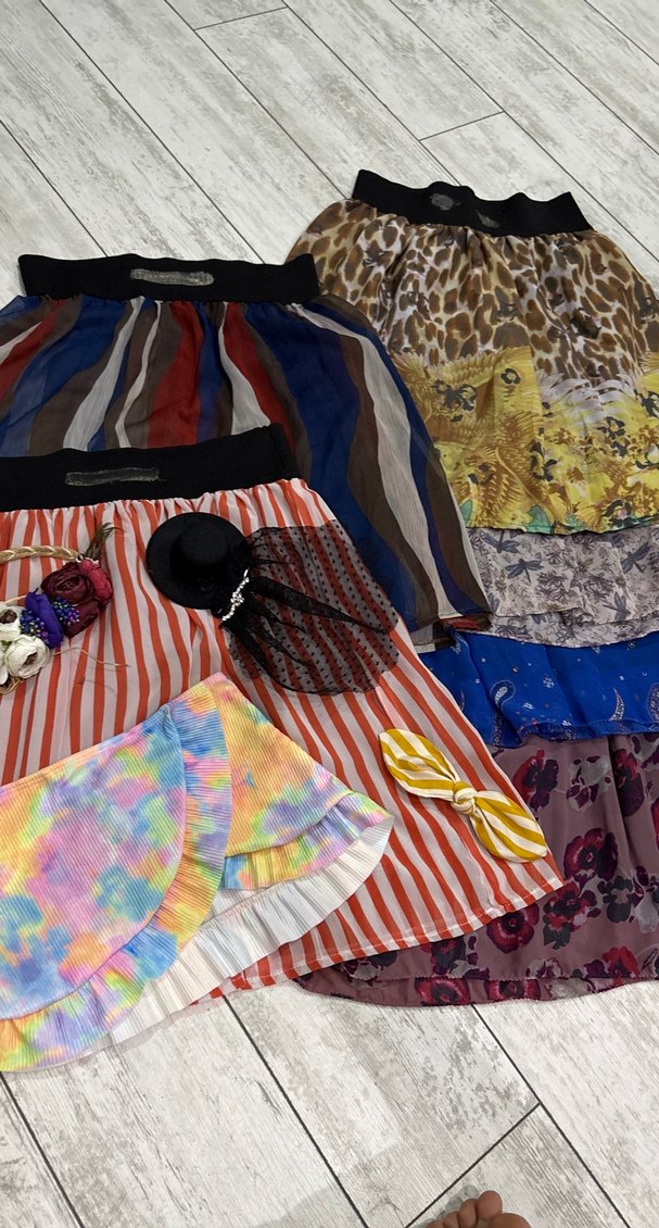 Renkli, pilili ve kiloş mini etekler, tie-dye ve hayvan desenleriyle günlük kullanıma uygundur. Beli lastikli 7 parça olmak üzere 11-12 yaş kız çocuk tütülü etek lastik kısmında beyaz lekeler var ben katlayarak giydirdim Gökkuşağı desenli olan 5 yaş kız etek Aksesuarlarla gönderilecek Bu ürünü alana dolabımdaki beyaz LCW markalı çocuk bluzu ve de mavi balo elbisesi de hediye olarak gönderilecek