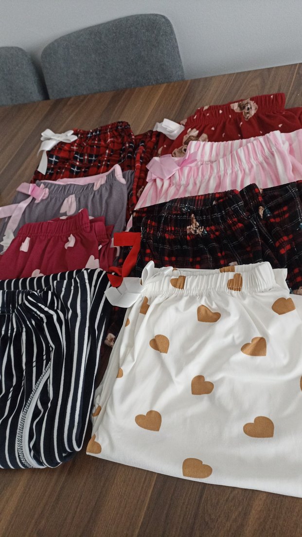 Renkli, rahat kesim ve yumuşak kumaştan yapılmış çeşitli desenlerde (kalpler, çizgiler, ekose) kadın mini pijama altları.