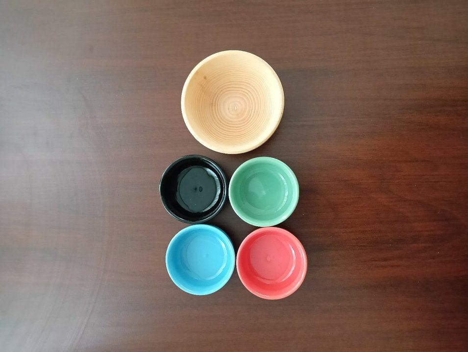 Beş adet küçük, desen içermeyen seramik kase seti. Açık ve canlı renklerde, sade ve geleneksel tarzda tasarlanmıştır.