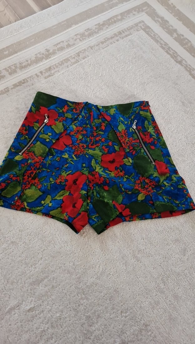 Sentetik kumaştan, desenli ve fermuarlı cepli renkli, vücuda oturan mini şort.