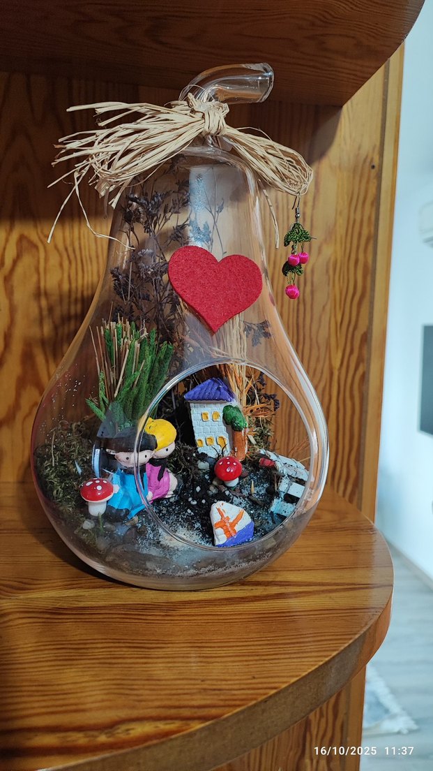 Cam fanus içinde küçük ev ve figürlerin bulunduğu renkli mini teraryum, üstünde kalp süsü ile dikkat çekiyor.
