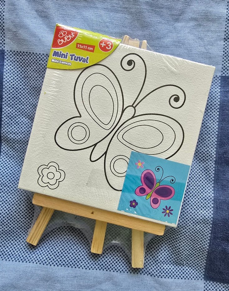 3 yaş ve üzeri çocuklar için 11x11 cm boyutunda, kelebek desenli renkli mini tuval ve ahşap stand. Yaratıcılığı teşvik eder.