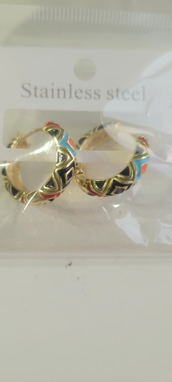 Paslanmaz çelikten, renkli yılan desenli ve boncuklu kısa halka küpeler. Bohem ve vintage tarzlar için uygundur.