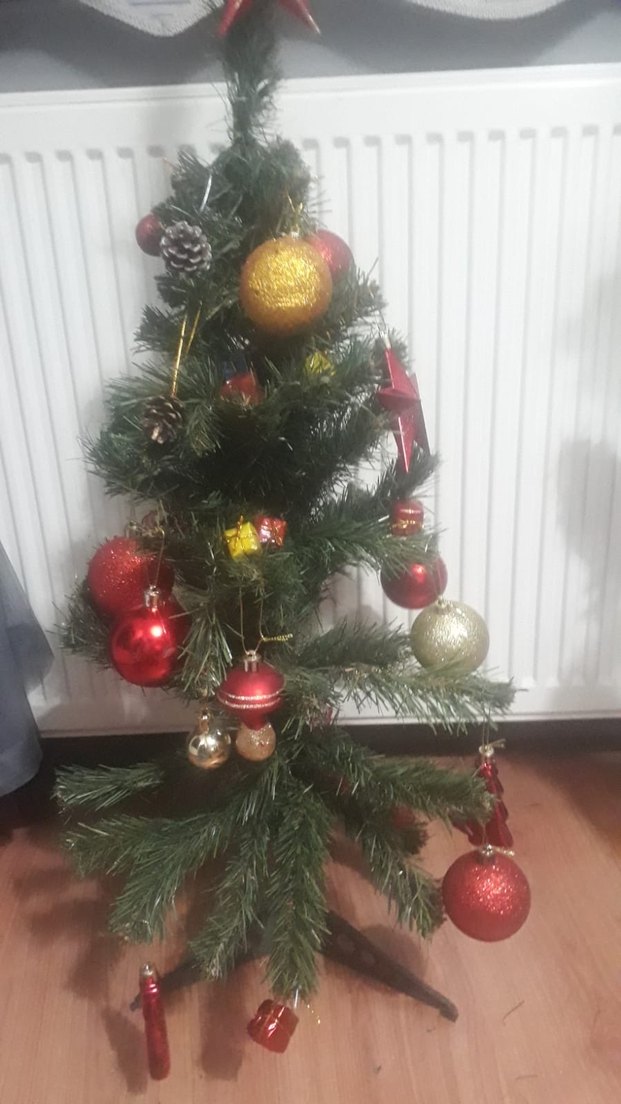 Bu renkli mini yılbaşı ağacı süsü, kırmızı, altın ve kozalak detaylarıyla şık bir tatil atmosferi yaratır. 87cm