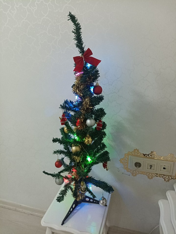 Renkli ışıklar, kırmızı kurdeleler ve çeşitli süslemelerle dekore edilmiş mini yılbaşı ağacı.