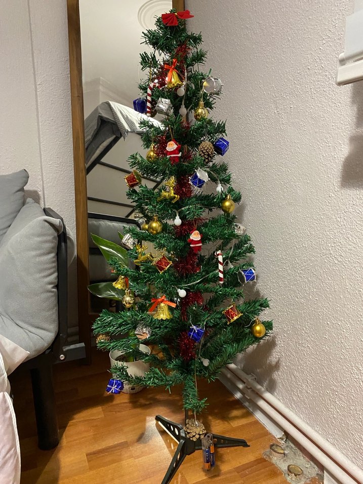 Çeşitli küçük süslerle dekore edilmiş renkli mini yılbaşı ağacı. süsleriyle beraber ama led ışık dahil değil
