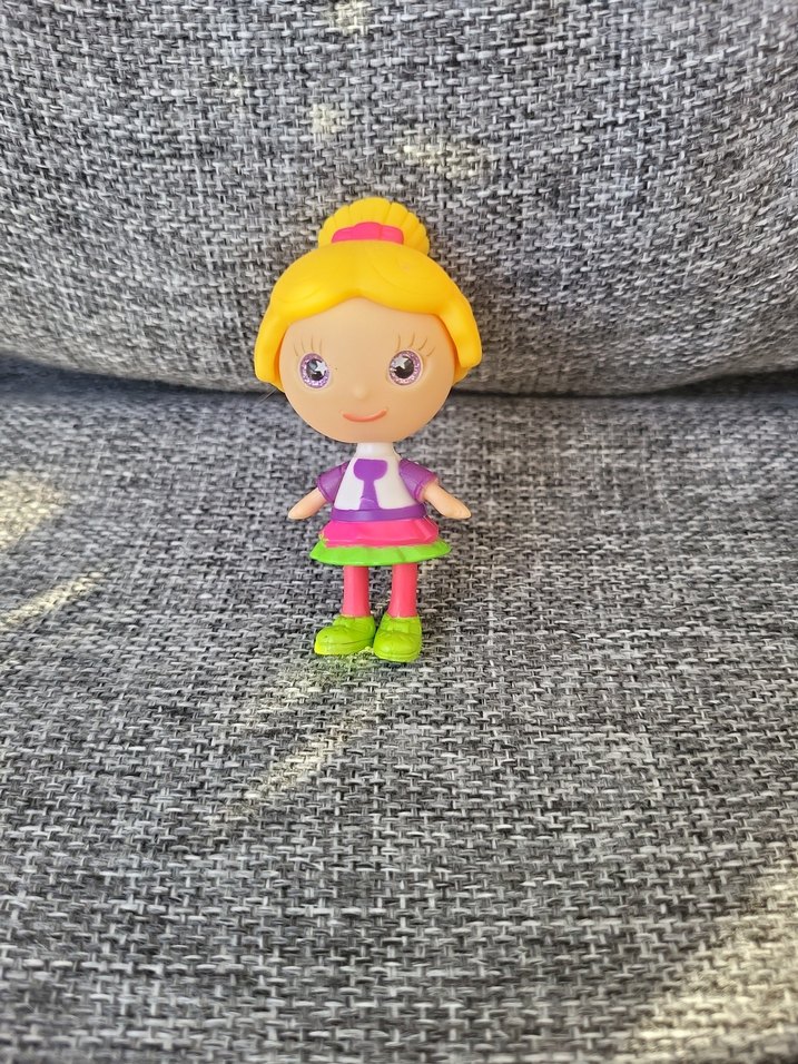 Sarı saçlı, mor ve pembe kıyafetli, yeşil ayakkabılı renkli küçük kız bebek oyuncak. Canlı renklerle oyun için uygun. 7 cm boyunda. 1 ADET için fiyatı.
