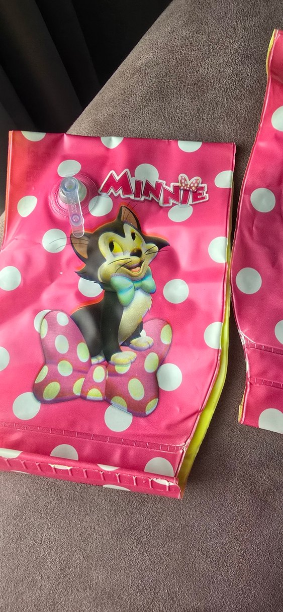Renkli, pembe zemin üzerinde Minnie baskılı, puantiyeli ve deniz icin kolluk. Pop kültür tarzında tasarlanmıştır.