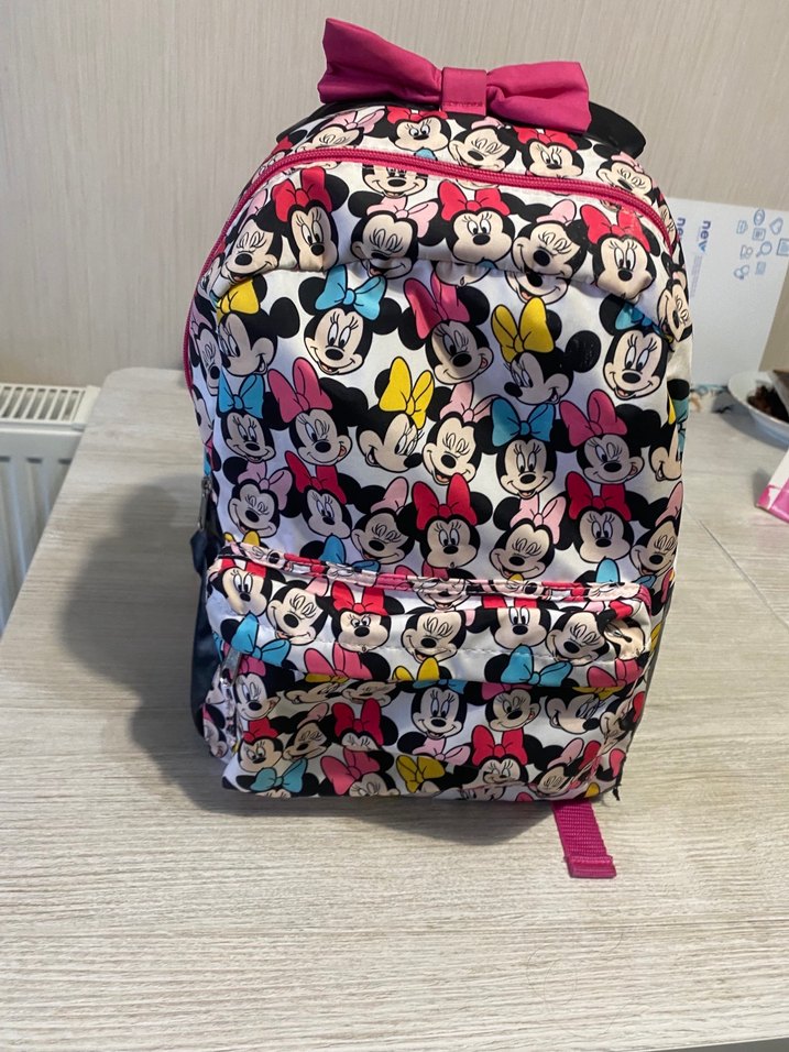 Çok renkli Minnie Mouse desenli çocuk okul çantası, canlı fiyonk detaylıdır.