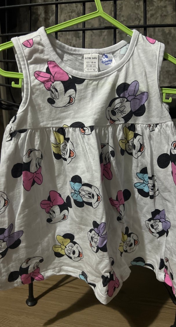 Renkli Minnie Mouse baskılı, kolsuz ve bol kesim kız elbisesi, fırfır detaylıdır. Trendy ve rahat bir tarza uygundur.