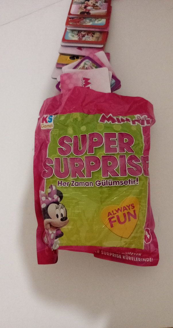 Renkli pembe Minnie Mouse sürpriz paketi, "SUPER SURPRISE" ve "Her Zaman Gülümsetir!" gibi neşeli mesajlar içeren eğlenceli kartlar içerir.
