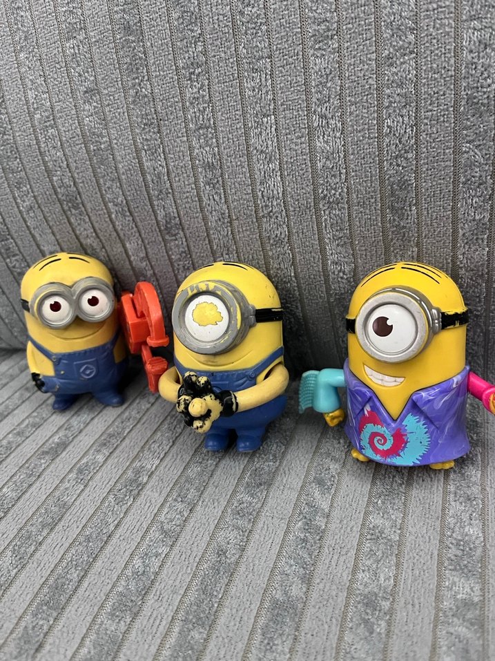 Üç renkli Minyon figür seti, her biri farklı aksesuar ve canlı detaylara sahip. Parlak sarı renkli ve eğlenceli ifadeler içerir.