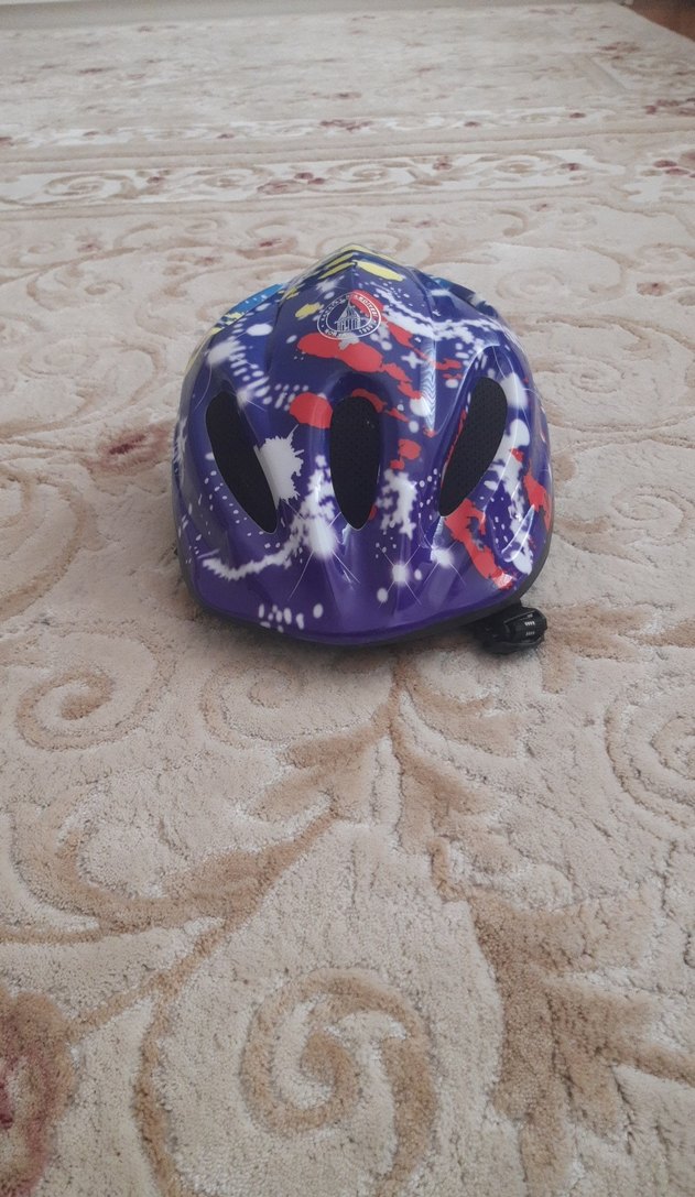 Renkli mor baskılı motosiklet kaskı, plastikten üretilmiş ve cırt cırtlı kayışlara sahip. Sokak stiline uygun rock punk havası verir. ️