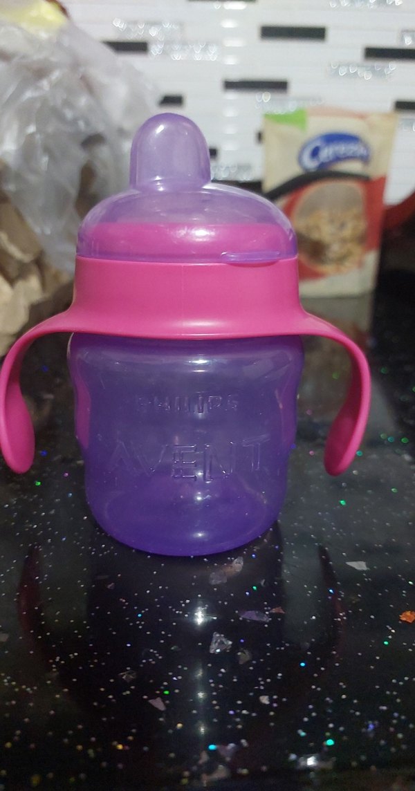 Mor gövde ve pembe kulplara sahip renkli bebek biberonu, kolay tutuş için tasarlanmıştır.