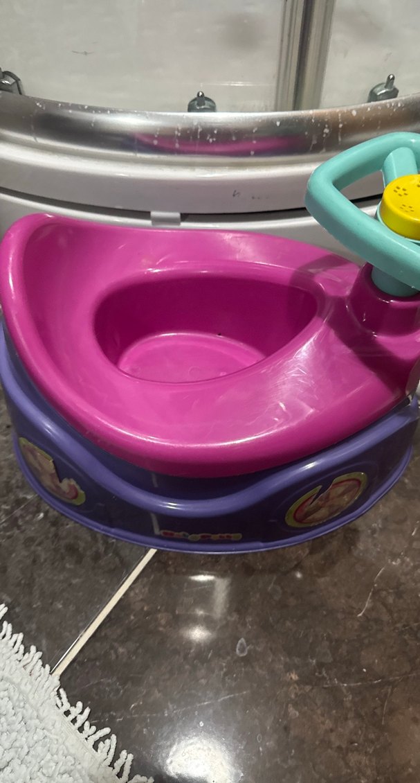 Mor renkte, rahat oturma alanı ve oyuncu direksiyon simidi bulunan renkli bebek yürüteci. Yürüme desteği için uygundur.