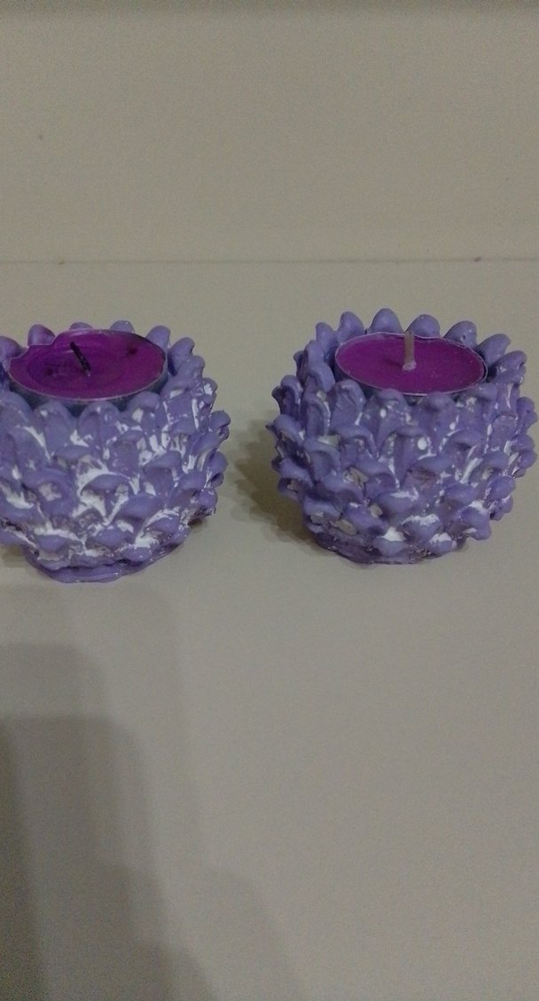 İki renkli mor çam kozalağı şeklinde mumluk, uyumlu mor mumlarla birlikte dekoratif bir dokunuş sağlar. ️ İçindeki renkli mumlarla gönderilir