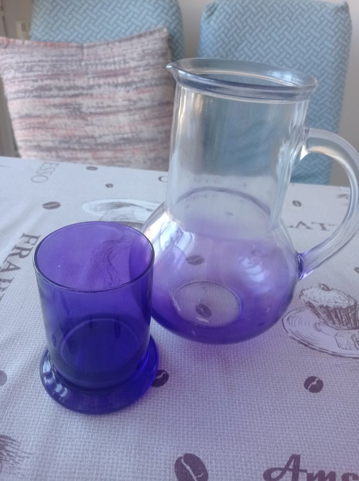 Saplı şeffaf cam sürahi ve canlı mor cam bardaktan oluşan renkli set. Başucu surahisi