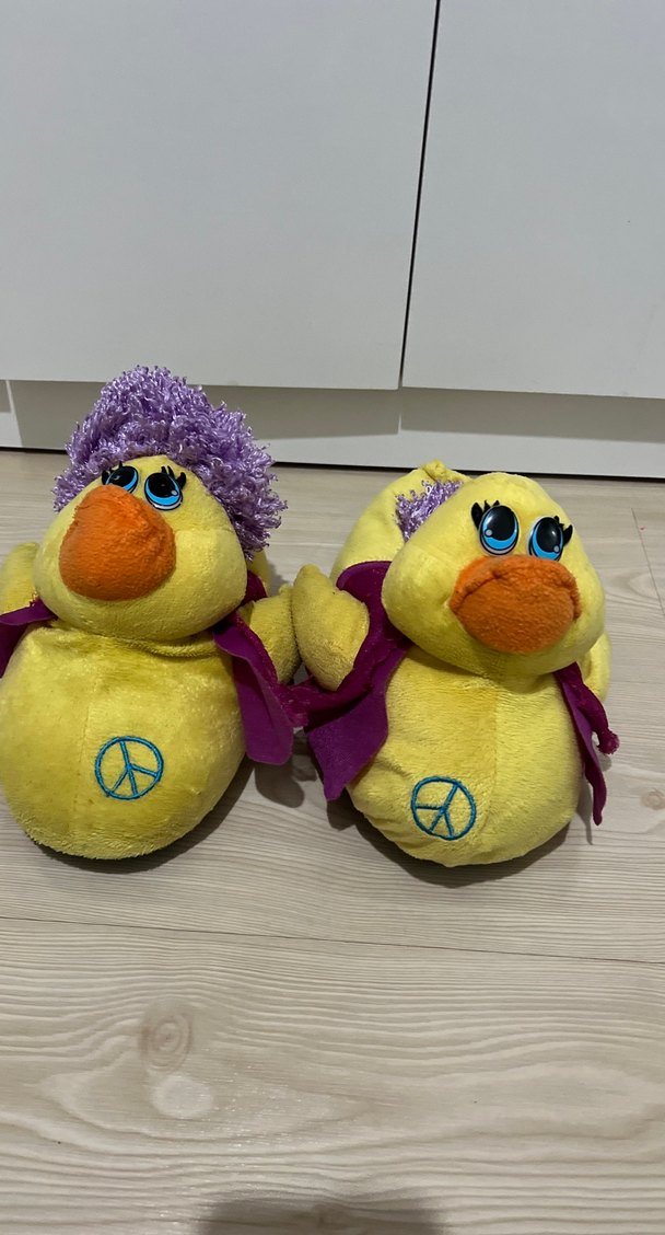 Canlı sarı renkte, büyük turuncu gagalı, mor saç ve yelek detaylı, önünde barış işareti işlemeli peluş ördek panduf. Ürün orginal sadece tekinin mor yeri koptu kargoda gönderirim dikmeniz gerekir