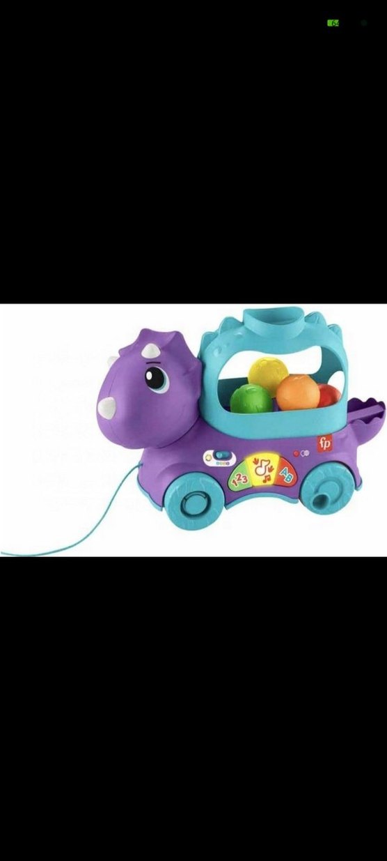 Renkli topları taşıyan, üzerinde sayı ve müzik simgeleri bulunan mor dinozor oyuncak. Tekerlekli ve eğitici özellikli.