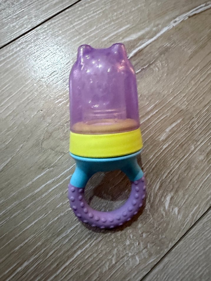 Mor dişlik ve koruyucu kapaklı renkli emzik, rahatlatmak ve diş çıkarma döneminde kullanılmak üzere tasarlanmıştır.