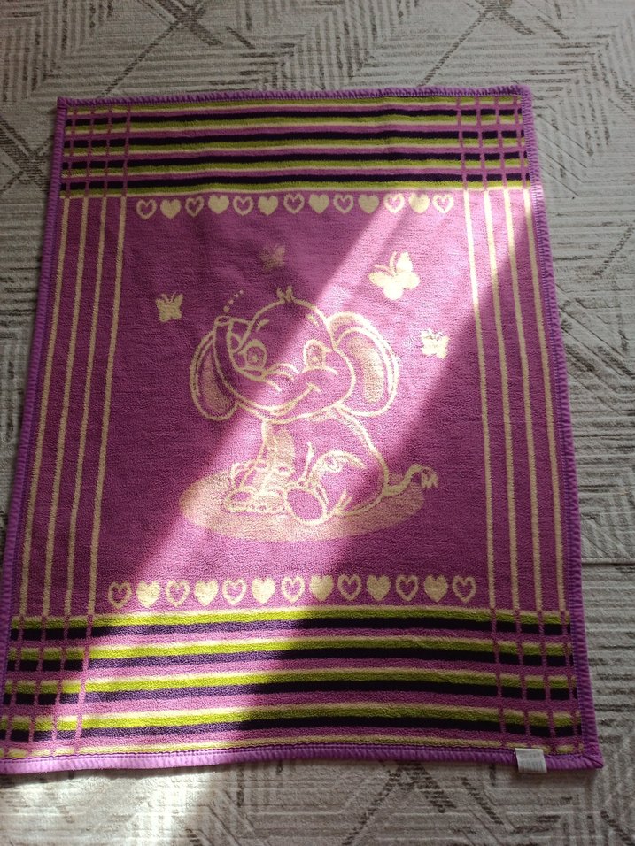 Yumuşak ve sıcak kumaştan yapılmış, renkli mor fil desenli çocuk battaniyesi.