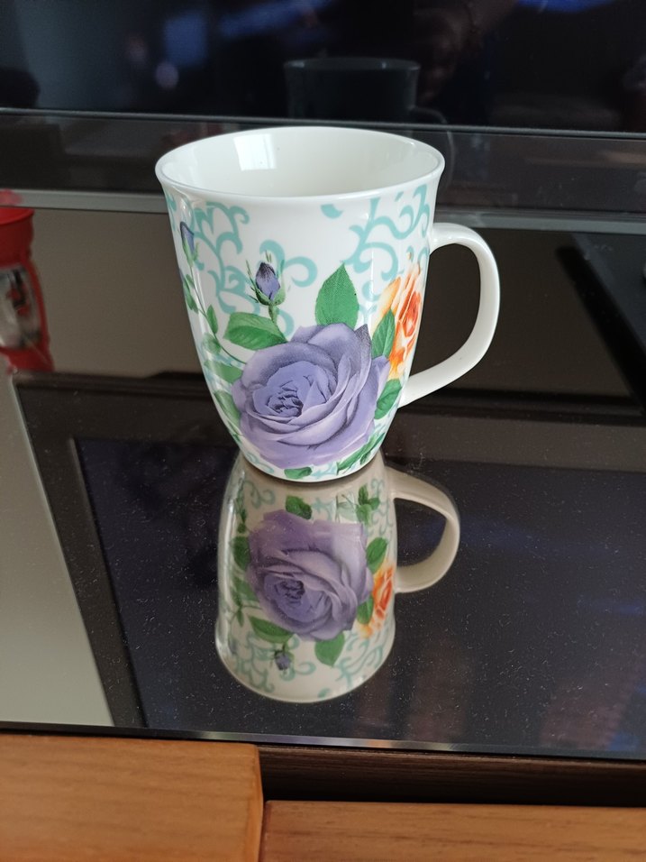 Renkli porselen kupada mor gül ve diğer çiçek desenleri bulunur. Rahat sapı ve pürüzsüz yüzeyi ile sıcak içecekler için uygundur.