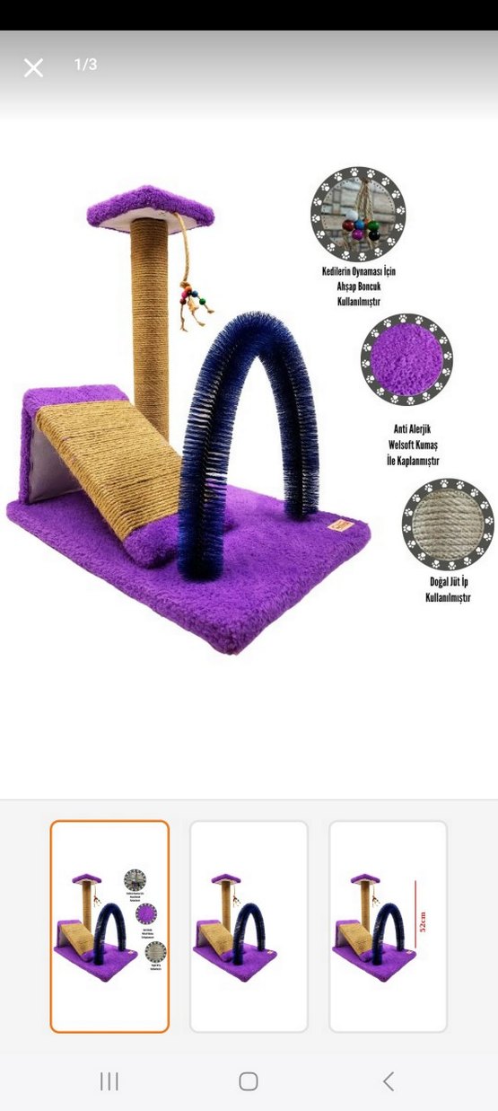 Renkli mor kedi aksesuarı, tırmalama direği, yumuşak taban ve oyuncaklı eğlenceli bir kemer içerir. Doğal lif ve anti alerjik yumuşak malzeme kullanılmıştır.