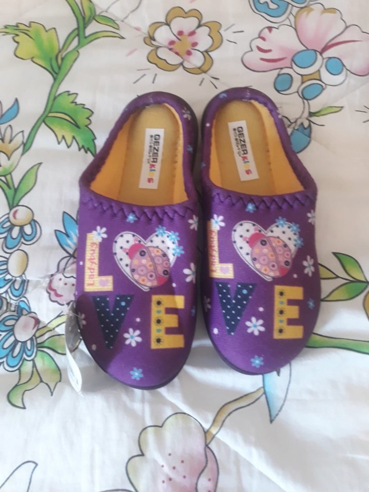 Mor renkli, kalp desenli ve 'LOVE' yazılı kız çocuk terlikleri, Velcro kapamalı ve kauçuk tabanlı, bohem pop kültür tarzında.