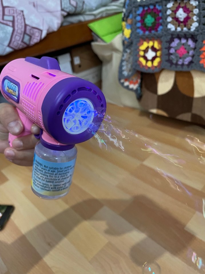 Renkli mor oyuncak tabanca, ışıklı köpük balonlar çıkarır. Kompakt tasarımlı, balon sıvısı haznesi ile birlikte gelir.