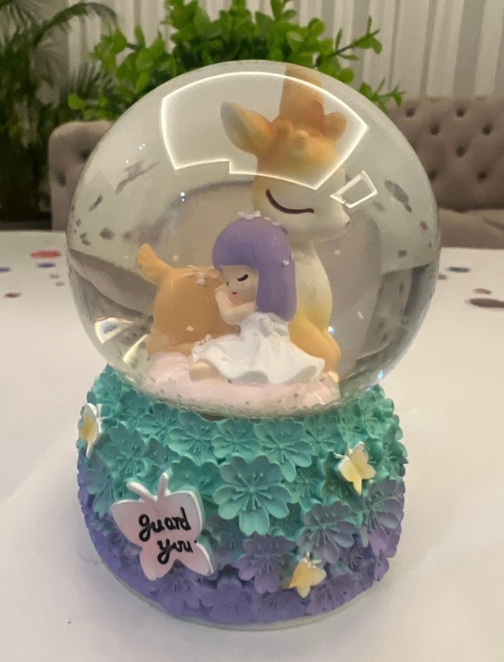 Mor saçlı kız ve geyik figürlü, çiçek desenli tabanlı ve 'guard you' yazılı kelebek detaylı renkli kar küresi. Kutulu sıfır ve ışıklı renk renk orta boy