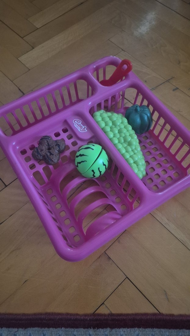 Çok bölmeli, renkli mor plastik sepet, oyuncak meyvelerle birlikte gelir.