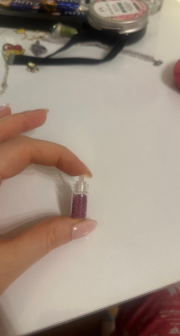 Parmak arasında tutulan küçük renkli mor tırnak süsleme boncukları. Tırnaklara canlı detay katmak için uygun.