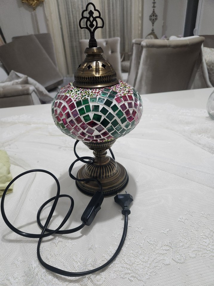Renkli mozaik desenli, vintage tarzında metal tabanlı masa lambası. Elektrikli ve dekoratif bir görünüm sağlar.
