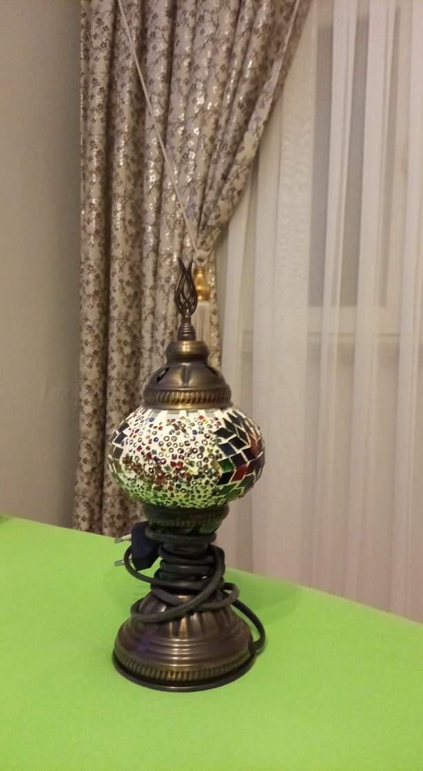 Renkli mozaik cam abajurlu, antik görünümlü metal tabanlı masa lambasıdır. Her odaya canlılık katar.
