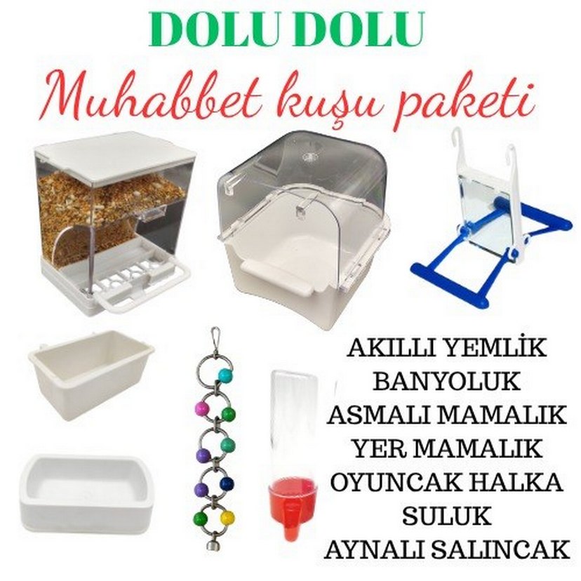 Renkli muhabbet kuşu bakım seti; suluk, akıllı yemlik, banyolu, asmali mama, yer mama, oyuncak ve aynalı salıncaktan oluşur.