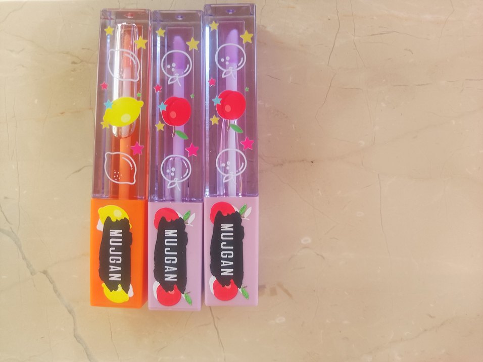 Rengarenk, meyve ve yıldız desenli ambalajda MUJGAN marka dudak parlatıcıları seti.