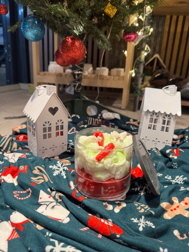 Renkli mum ve kalp ile pencere kesitli beyaz ev şeklinde mumluk, şenlikli kumaş üzerinde yer alıyor. ️
