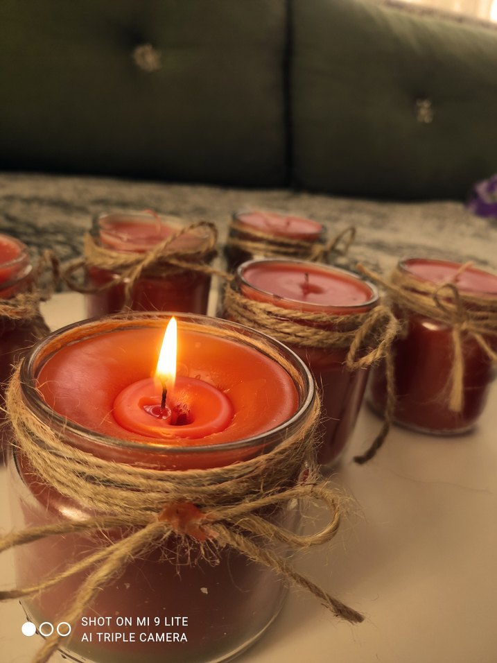 Hasır ip ile süslenmiş renkli cam kavanoz mumlar, sıcak ve samimi bir atmosfer sağlar. ️