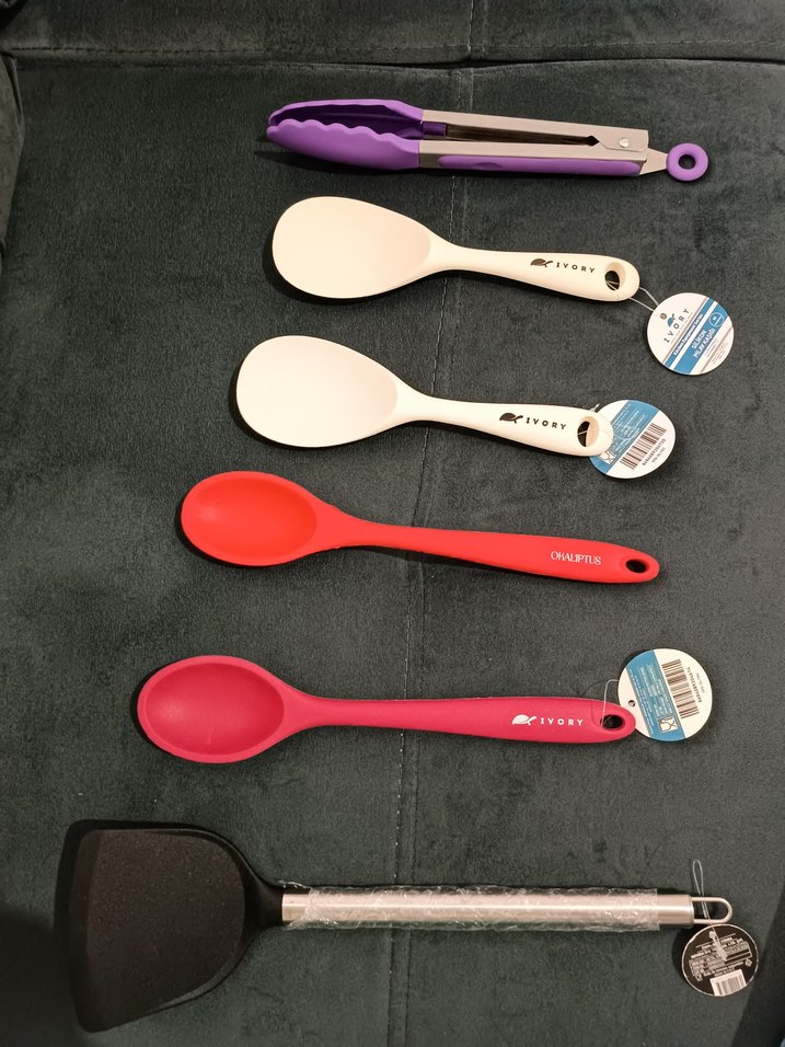 Beyaz, kırmızı ve pembe renklerde mutfak kaşıkları, mor mutfak maşası ve siyah saplı spatula içeren mutfak seti. Pratik kullanım sağlar.