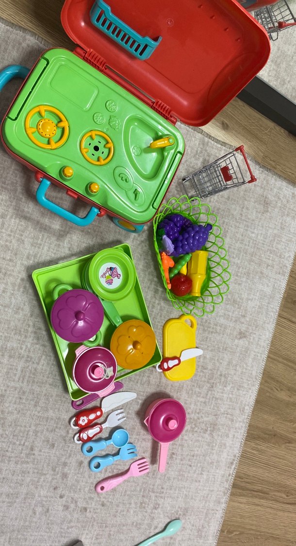 Renkli oyuncak seti, ocak, mutfak gereçleri, tabaklar ve plastik meyve sepeti içerir. Hayal gücünü destekler.