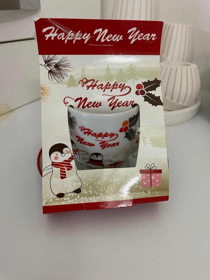 Renkli penguen ve çam yaprağı desenleriyle süslenmiş, üzerinde kırmızı 'Happy New Year' yazısı bulunan beyaz kupa. Yılbaşı temalı güzel bir hediye seçeneği Elimde çeşitleri mevcuttur .