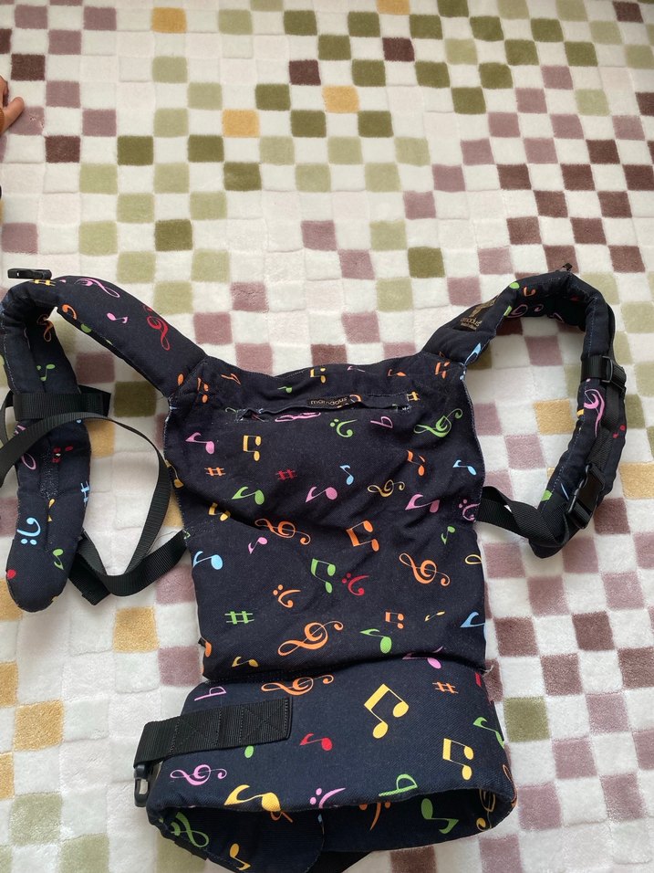 Ayarlanabilir askılara sahip, müzik notaları desenli renkli bebek kangurusu. Bebekleri güvenli taşımak için uygundur.