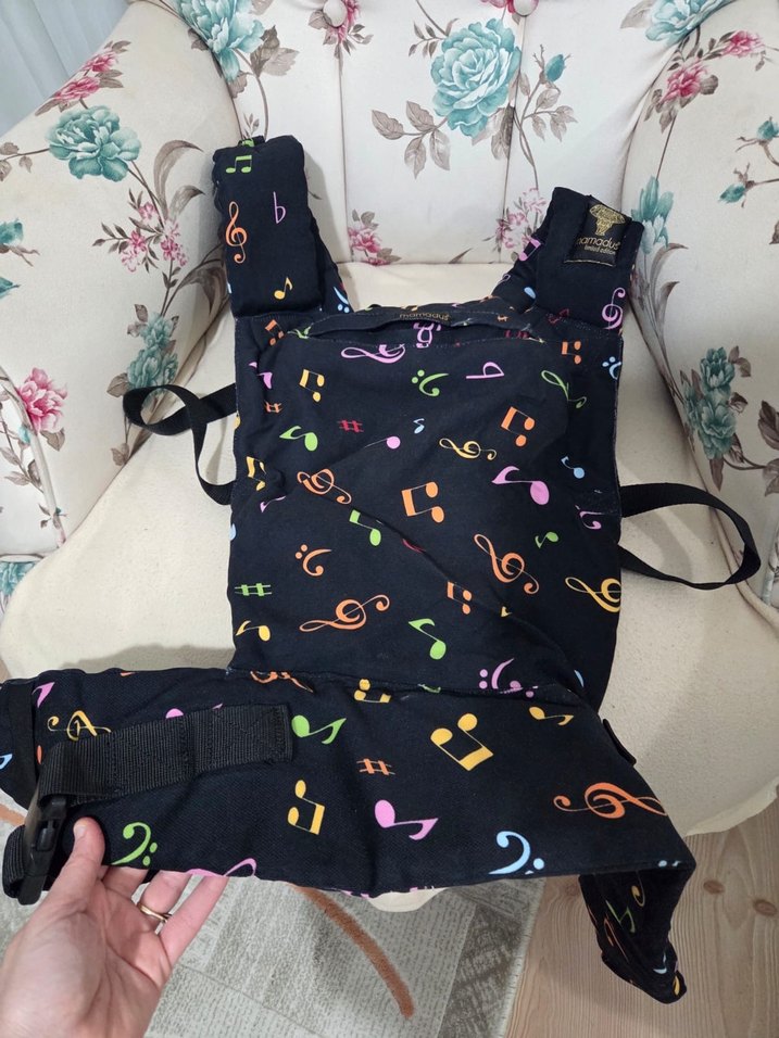 Ayarlanabilir askılı, siyah zeminde renkli müzik notaları desenli bebek taşıyıcı. Kanguru hiç kullanılmadı. Sıfırdır. Mamadus markadır. Ergonomiktir.