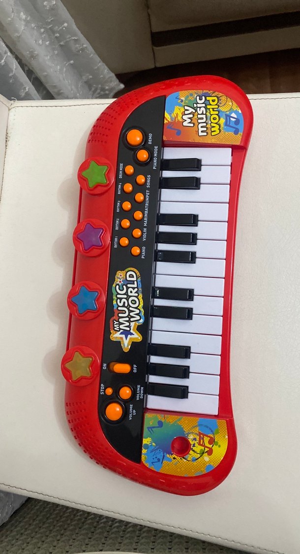 Renkli müzikal oyuncak klavye, farklı sesler ve modlar sunan çok sayıda tuş ve yıldız şeklinde düğmelere sahiptir.