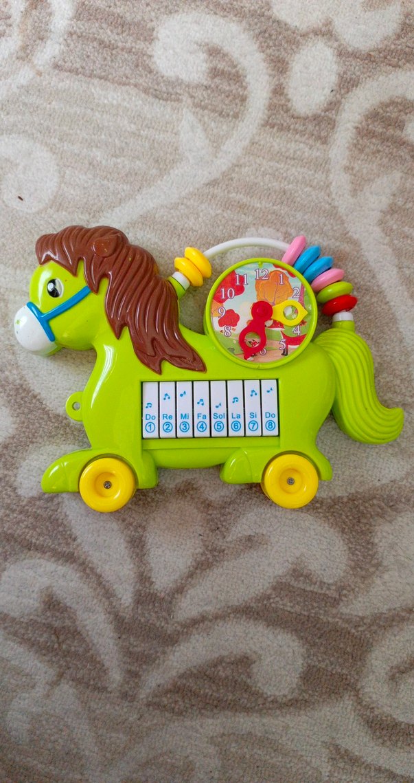 Saat, müzik notlarıyla etiketli piyano tuşları ve boncuk halkaları bulunan renkli at şeklinde eğitici oyuncak.